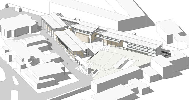 The existing Heritage block will now house the main lobby for these rooms and a restaurant. We see these as glass volumes inserted into the structure of this building with a new timber screen on the south face and a large metal roof hovering over it.