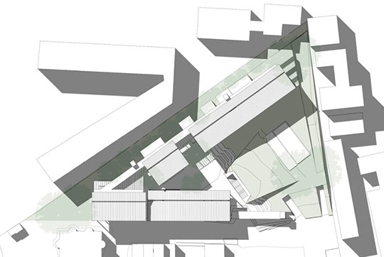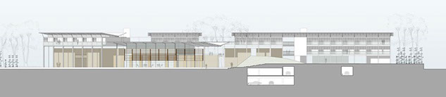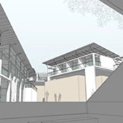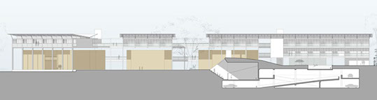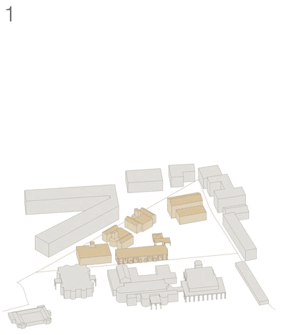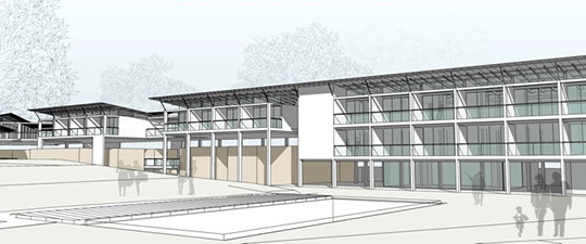 Aesthetically our proposal refers back to the club using the motif of the arcade with the large overhanging roof. As a result of housing most of the new guest rooms above the existing buildings the supporting arcade creates a consistent face to these existing buildings and gives the open space a definition.