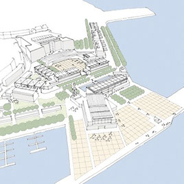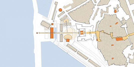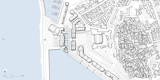 Our proposal suggested that we could reconnect the historic core of Crotone to the waterfront via new public institutions that served to mitigate the 30m level difference and created new public places along the waterfront. The new uses proposed included public museums, a performing arts center, a market, office buildings, housing, a city room, a library, and a marina.