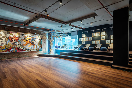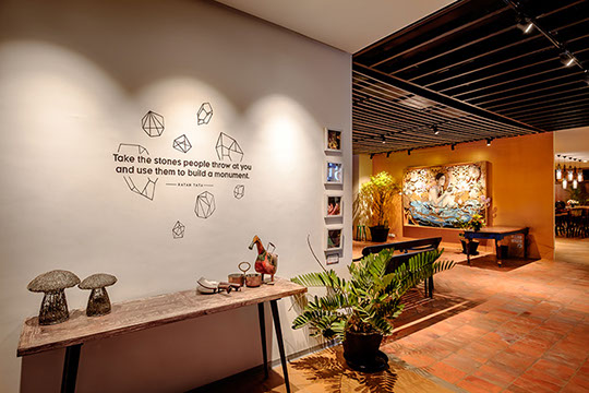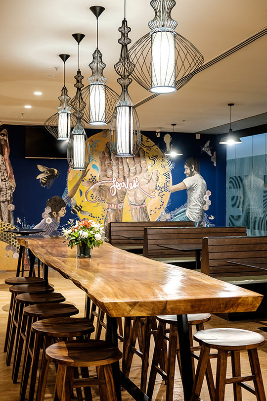 Right from the start our client was interested in commissioning site specific art for the space and brought on board the celebrated local artist KK Raghava to curate the art. He set up a short term residency and invited other artists like Shilo Shiv Suleman, Sean Stevens and Nikhil More to develop a narrative and collaborate with us to integrate art into the interior design of the space.