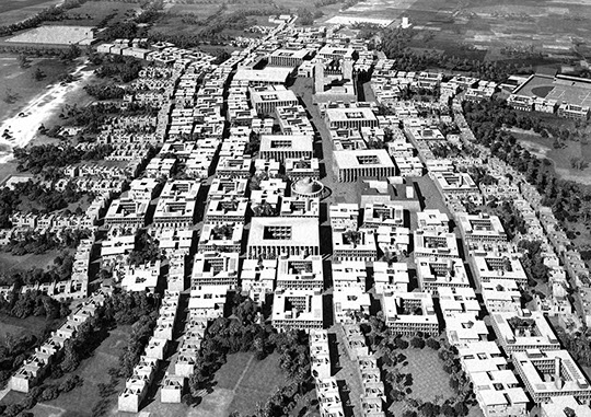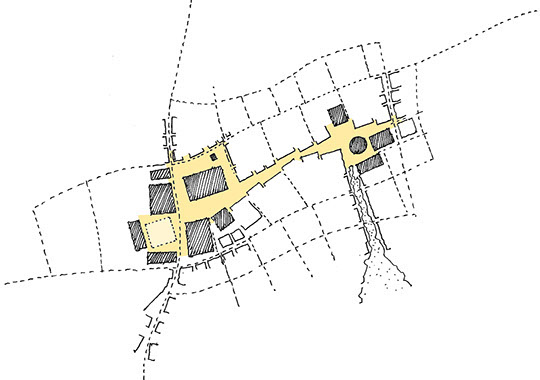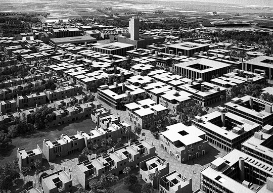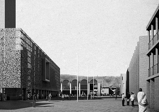 A comfortable series of interlinked spaces provide an urban pattern with a relaxed permeability and a clear hierarchy. A series of pedestrian routes link every building and lead directly to a primary street in which the major university activities are located. This spine is anchored, at one end, by the library and at the other by a museum, auditorium and temple.
