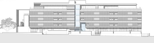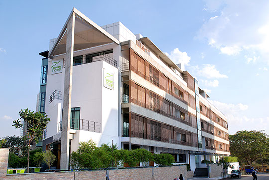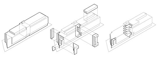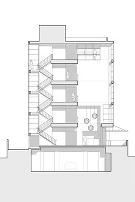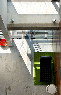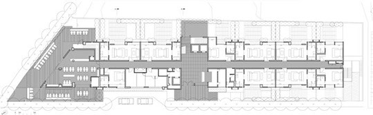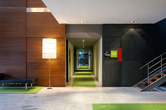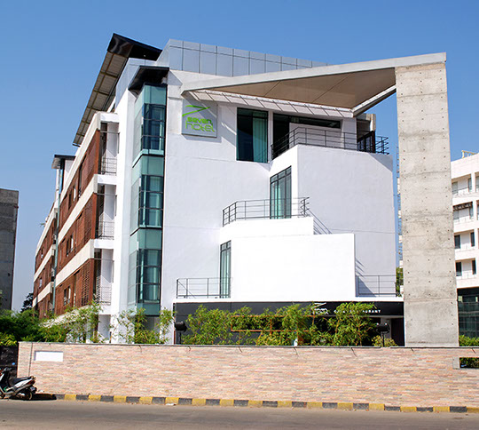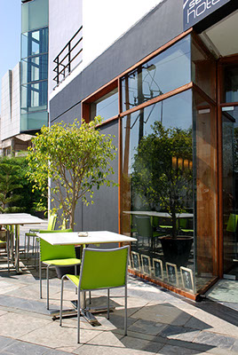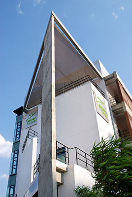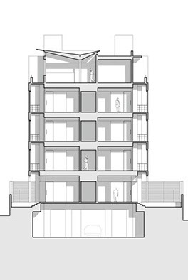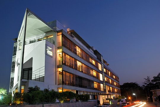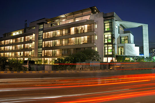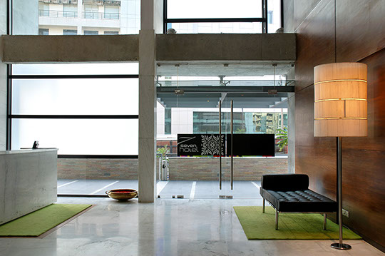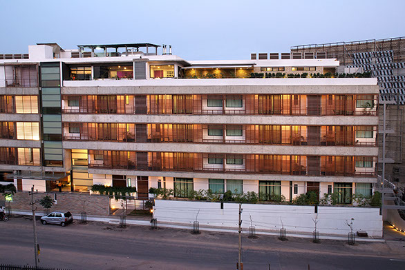 Situated on a narrow semi-urban lot, the plan for this 54 room business hotel had to be slightly modified from the typical hotel model of the central double-loaded corridor with toilets along it and the rooms along the peripheries. The central corridor remained but the rooms and the toilets now shared the external surface.