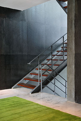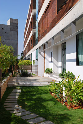 Large balconies ran along the east and west facades and these were encased in sliding teak screens. These enclosed extensions of the rooms work well in Bangalore’s moderate climate. The interiors were done in a palette of local granite, Indian marble and timber.