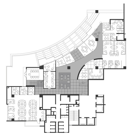 A response was made to stunning views of the Varthur lake and the objective of getting as much natural light into the heart of the plan as possible by using clear curved glass enclosures along the periphery of the office and locating the large conference rooms and senior offices appropriately.