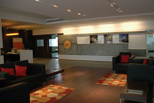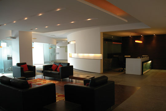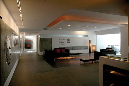 This 12,000 sft. corporate office for a property developer was to reflect the values of the company. The use of natural materials, simple and clear aesthetic choices and a generous use of space were the primary drivers. The interior is a mix of a small palette of materials - white stucco walls, exposed concrete, polished timber, antique-finish black granite and clear glass.
